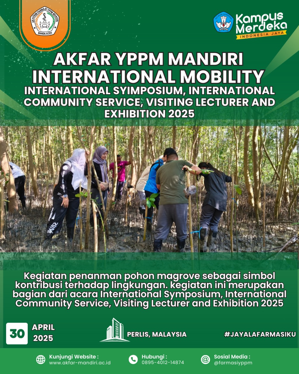 Perlis – Akademi Farmasi YPPM Mandiri Banda Aceh mengikuti kegiatan FKPT Mobility Internasional, melakukan penanaman bakau di kg.ketam kuala perlis, Malaysia pada Rabu (30/04/2025).
