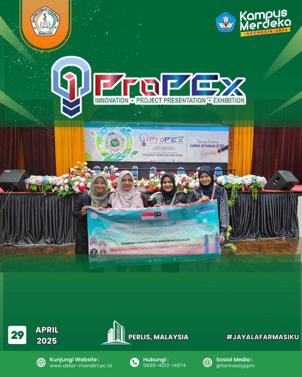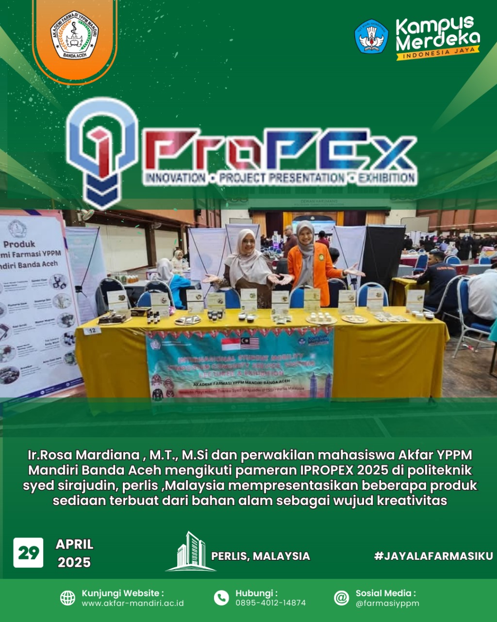 Akademi Farmasi YPPM Mandiri Banda Aceh melakukan Pengenalan dan penjelasan hasil produk pada Acara IPROPEX PTSS 2025 Kolej Komuniti Arau perlis, Malaysia pada Selasa (29/04/2025).